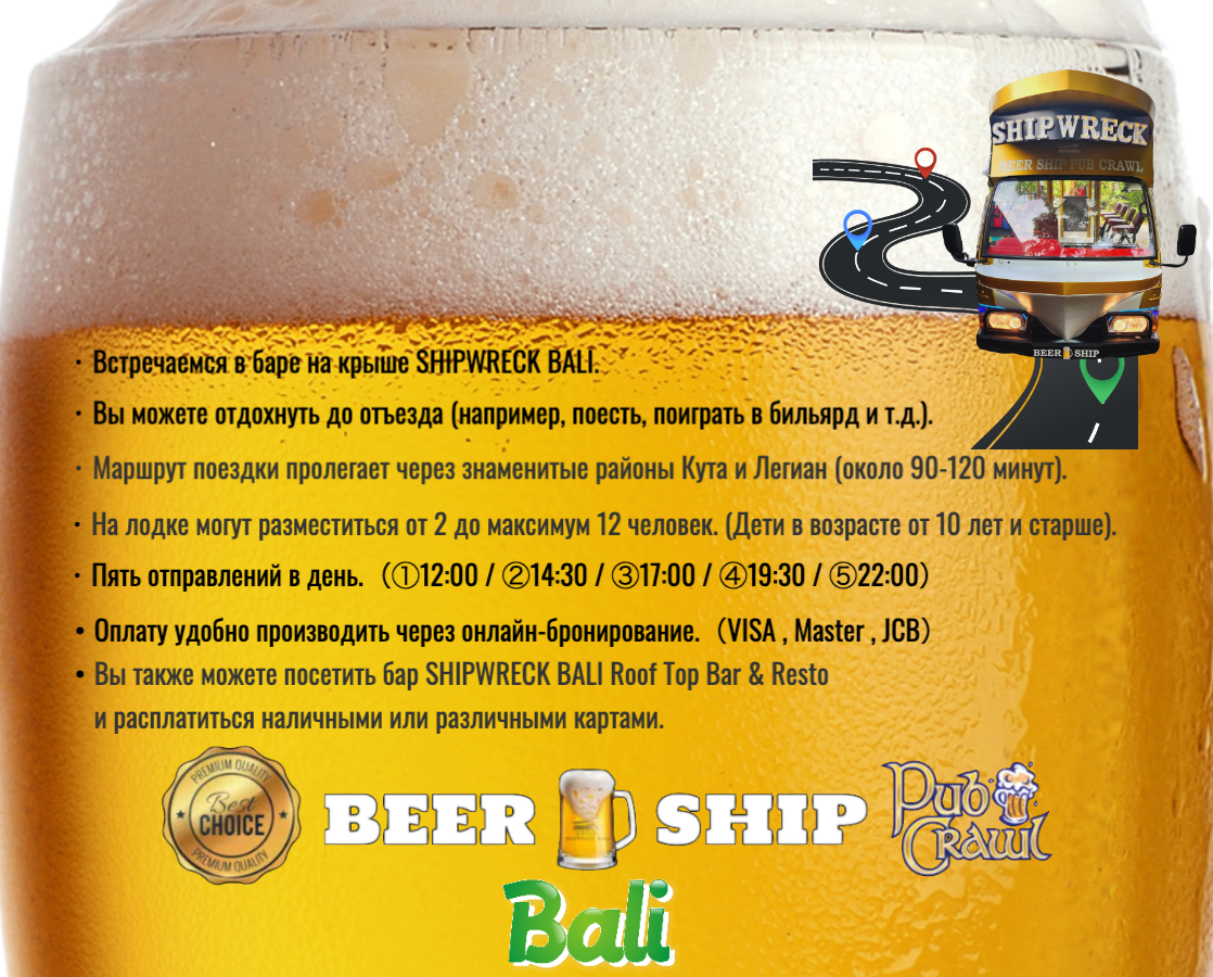 Поскольку в настоящее время мы проводим акцию, вы можете выбрать один бесплатный виски или водку на ваш выбор, поэтому, пожалуйста, наслаждайтесь ими с содовой, колой или минеральной водой.Кроме того, до или после Beer Ship Pub Crawl в SHIPWRECK BALI Rooftop Bar & Resto будет подан бесплатный обед или ужин в виде шведского стола. Помимо призов за участие, вы также сможете принять участие в розыгрыше рулетки с отличными призами.