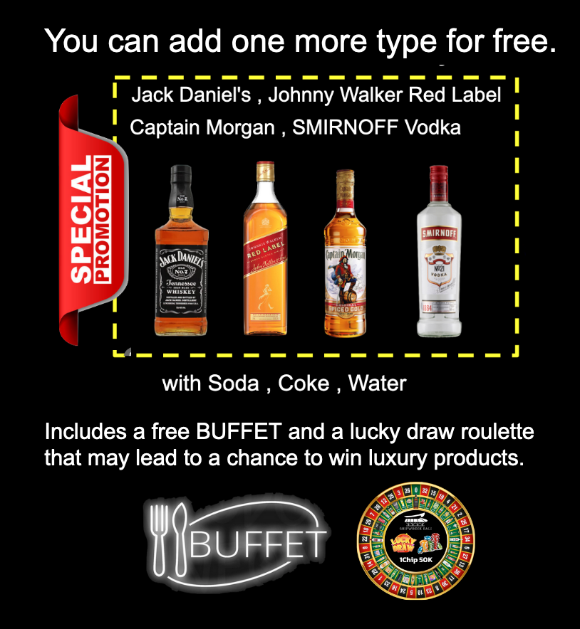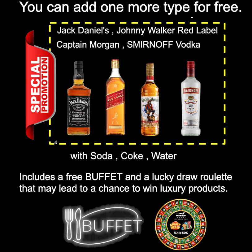 На выбор одна бутылка любимого напитка (Jack Daniels, Johnnie Walker Red Label, Captain Morgan, Smirnoff Vodka). Газированная вода, кола или минеральная вода включены в стоимость.